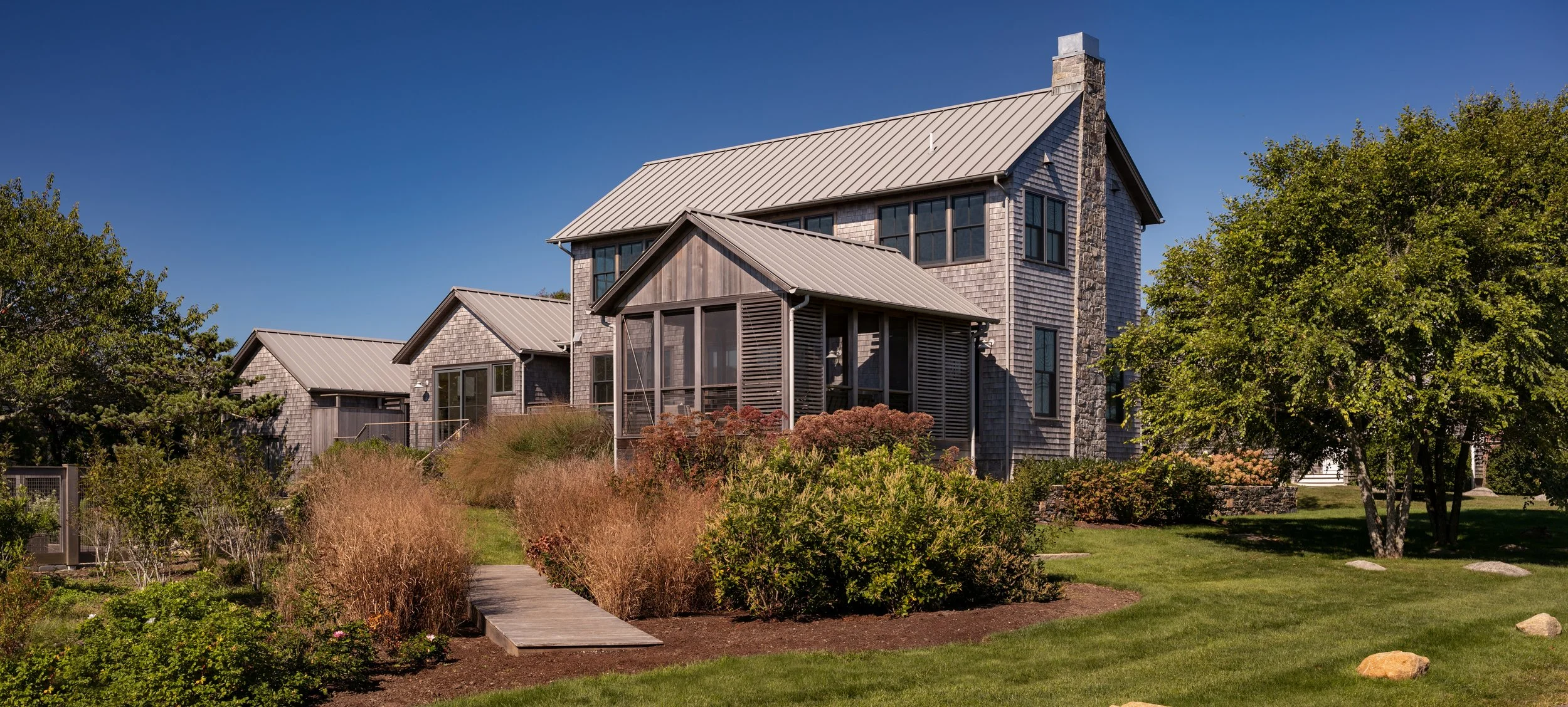 With retirement on the horizon, the owners resolved to settle full time at their long time summer residence. The current house, set in a depression, was not compliant with the flood plain regulations and did not meet their future needs. After razing the current house, we set about creating a collection of spaces, lifted above the flood zone and connecting them with a south facing deck of varied levels. A fieldstone walled garden disguises the level change at the north formal entry. The main building is two stories with the kitchen, dining and living room at the first floor and three bedrooms and baths at the second floor. An angled wall, clad with white oak slats cuts through the first floor and separates the great room from the stair, mudroom and utility room. This angle continues in the tapered white oak desk that flanks the living room along the north wall. Salvaged oak beams overhead visually divide the great room and the kitchen and frame the fireplace and bookshelf wall. Adjacent to the glass and fully clad white oak entry hall is a separate study and guest bedroom. From the exterior, this reads as an independent space with it’s opposing gable form. Upstairs, the main bedroom offers the best views of the Atlantic Ocean and a punched and cantilevered balcony provides for an exterior lookout.
